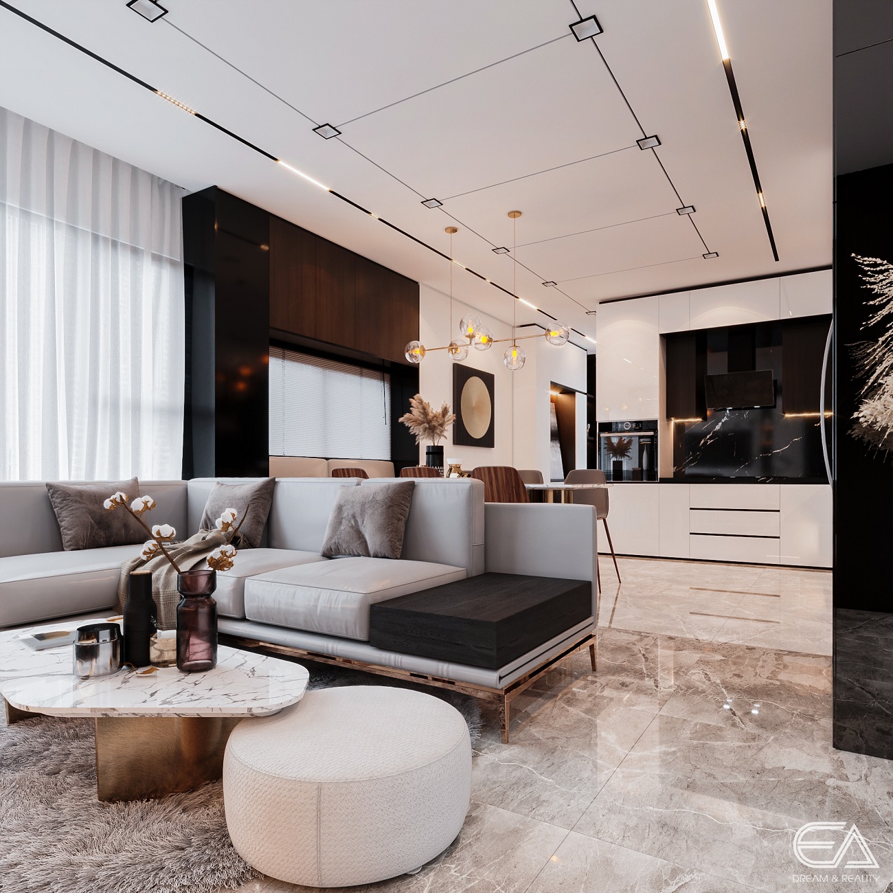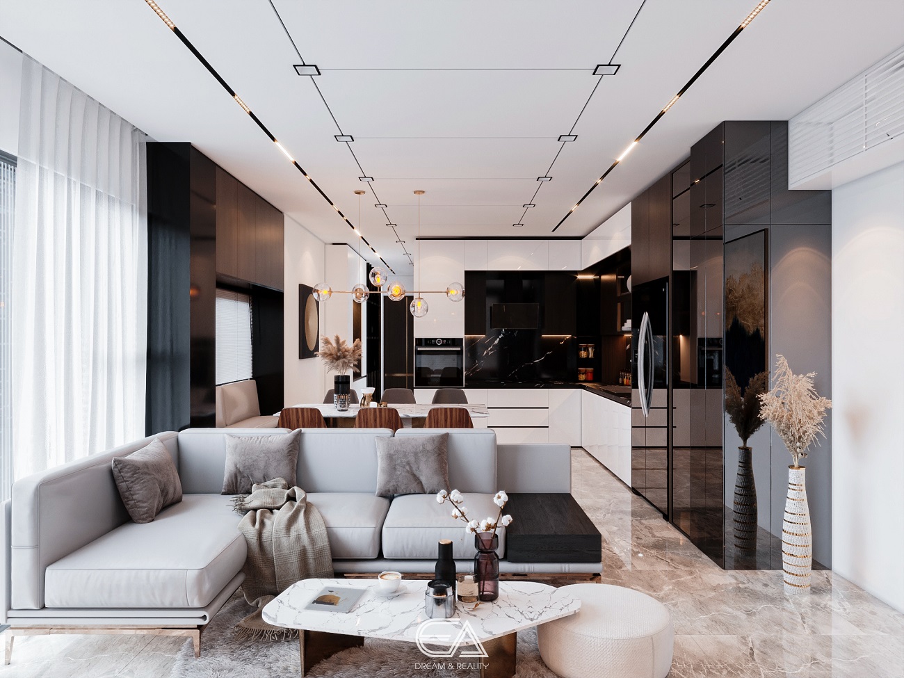 - Sử dụng sàn và trần liên tục: Sử dụng cùng một loại vật liệu và màu sắc cho sàn và trần để tạo cảm giác liền mạch.