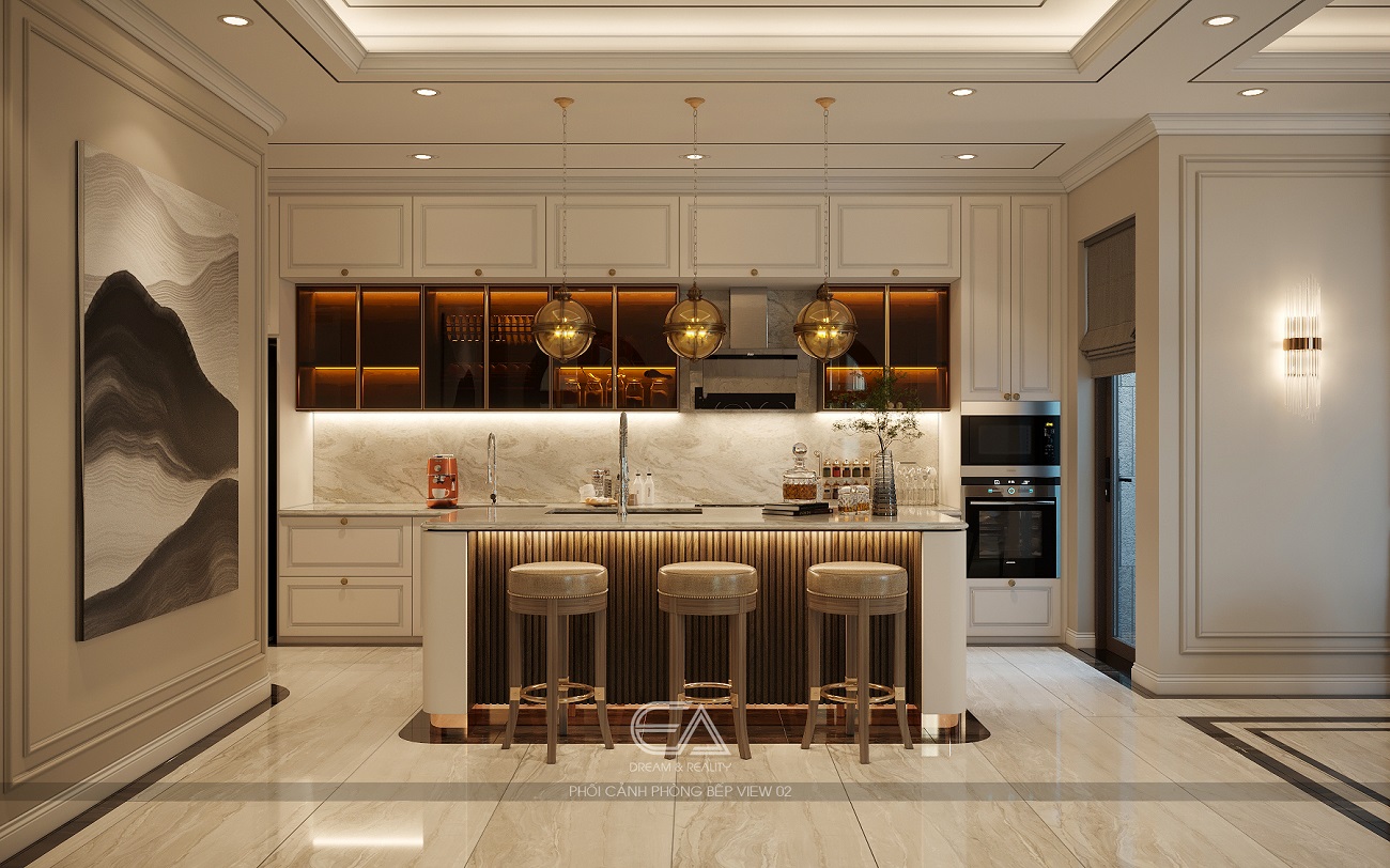Bếp Có Đảo – Trung Tâm Gắn Kết Gia Đình: Đảo bếp không chỉ tăng công năng mà còn là nơi quây quần, trò chuyện – biến căn bếp thành trái tim của ngôi nhà.