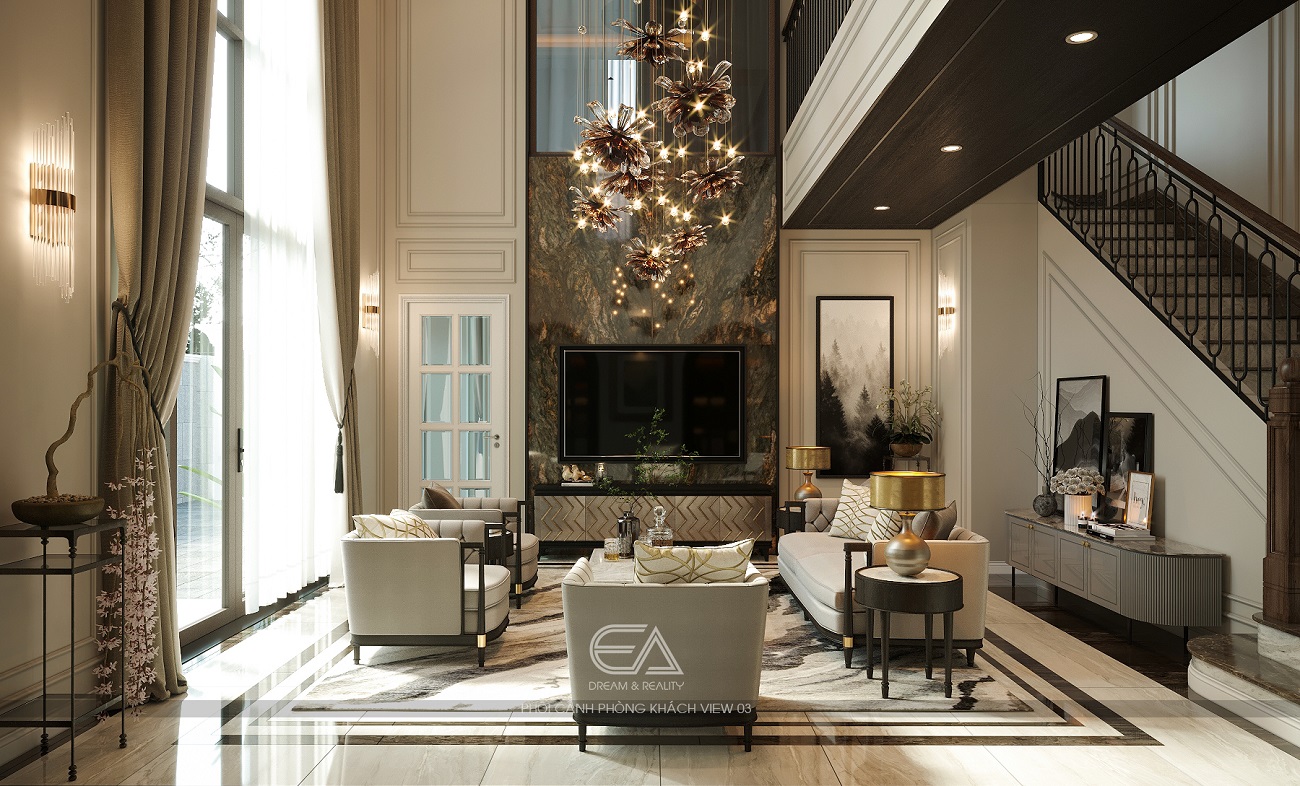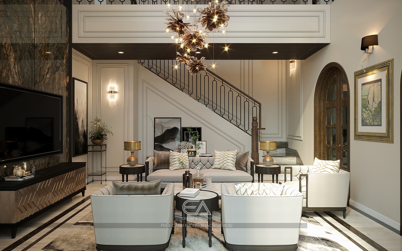 - Phong cách tân cổ điển: Kết hợp giữa vẻ đẹp cổ điển sang trọng và nét hiện đại tiện nghi, sử dụng các chi tiết trang trí như phào chỉ, hoa văn, cột trụ.